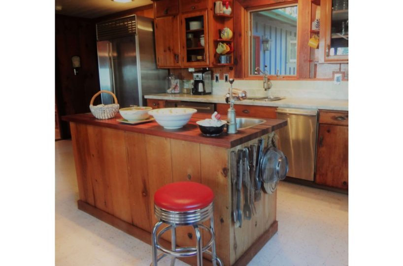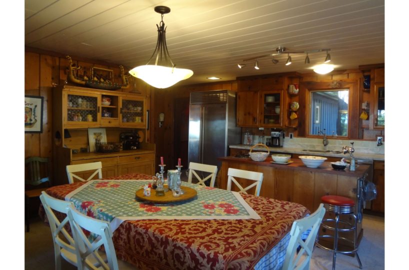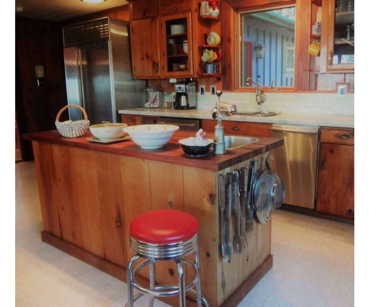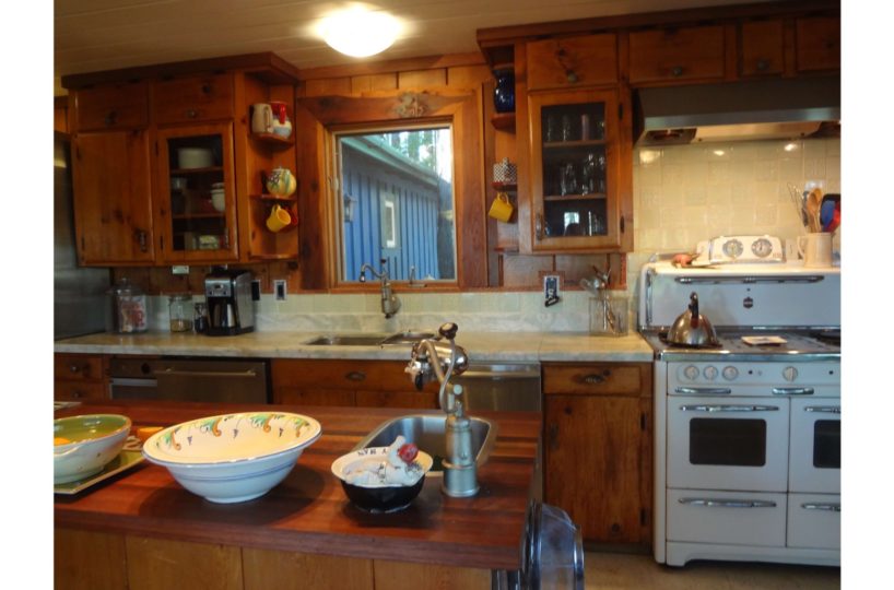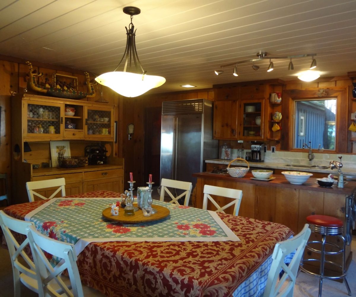 The main house has a spacious living room with wood burning stove, a wall of windows capturing the blue water view and a large deck for indoor/outdoor living. A wonderful country kitchen offers a vintage Wedgewood range, marble counters, butcher block topped island, redwood cabinets, Subzero refrigerator, huge hutch and cozy brick lined corner with propane stove. The master suite has its own sitting room, a bath designed with privacy in mind and a dressing room. A second bedroom has its own bath with a walk-through dressing room and opens to a wraparound deck with spa.